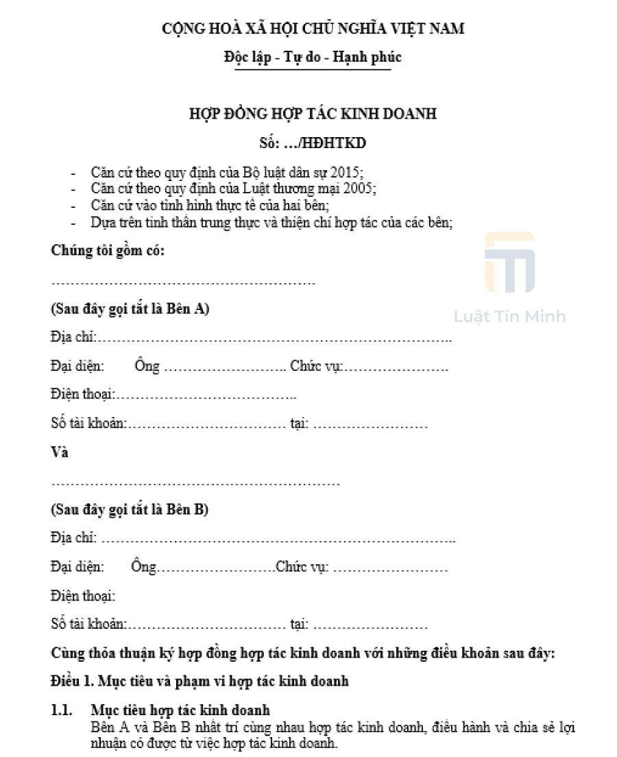 Dưới đây là mẫu hợp đồng hợp tác kinh doanh được cập nhật mới nhất, bạn có thể tham khảo và điều chỉnh nội dung sao cho phù hợp với nhu cầu, mục đích hợp tác của mình.