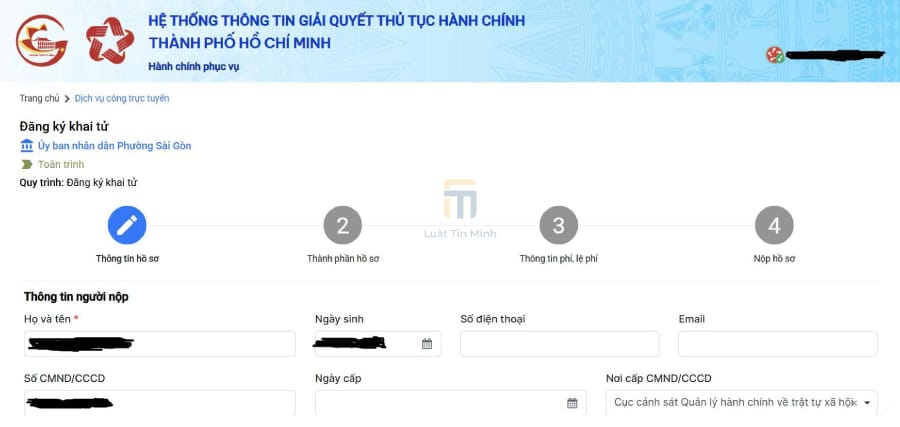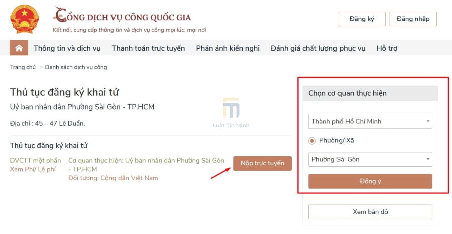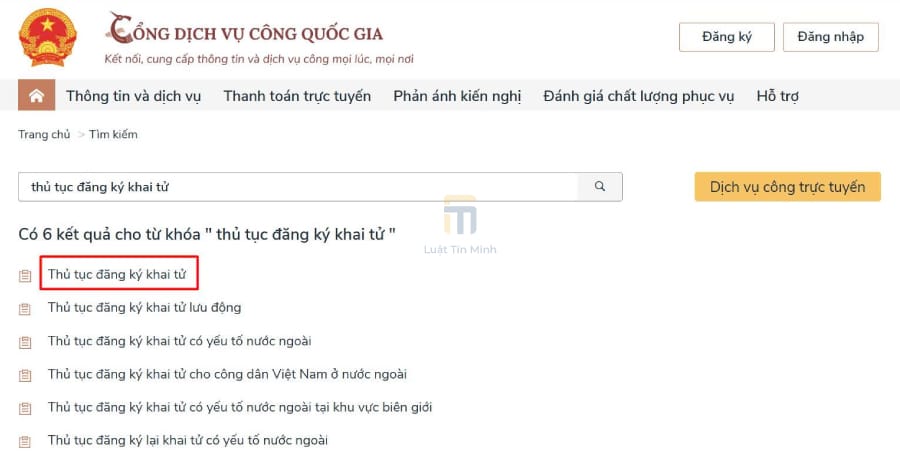 Tại thanh tìm kiếm của trang chủ, bạn nhập từ khóa tìm kiếm và chọn “Thủ tục đăng ký khai tử” ➞ Chọn cơ quan có thẩm quyền giải quyết, bấm “Đồng ý” ➞ Bấm “Nộp trực tuyến”.