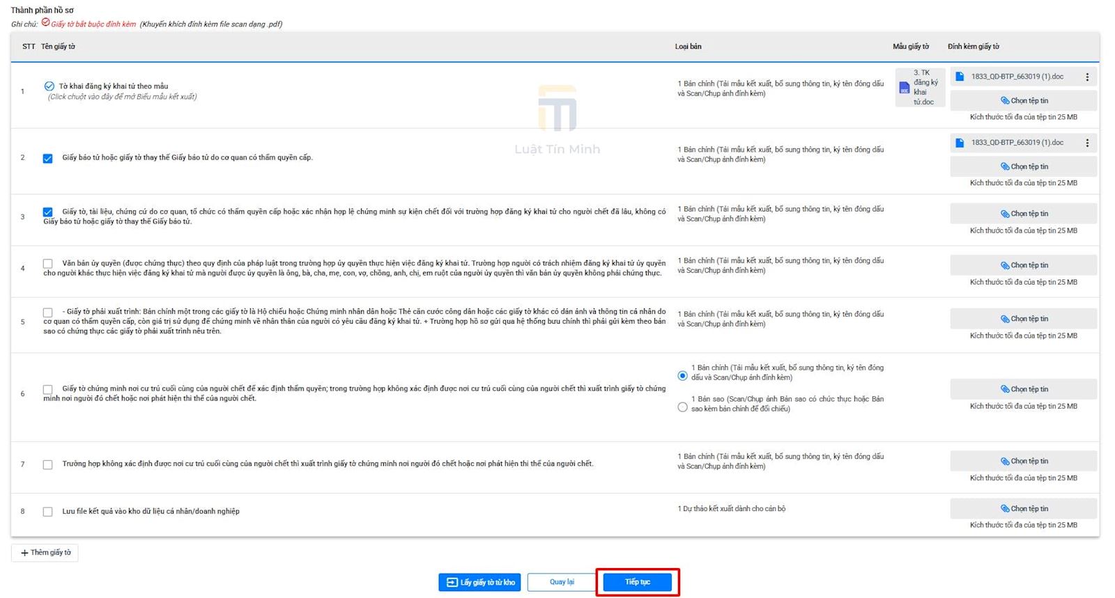 Bạn tiến hành tải lên bản điện tử của các giấy tờ trong bộ hồ sơ đăng ký khai tử, sau đó bấm “Tiếp tục”.