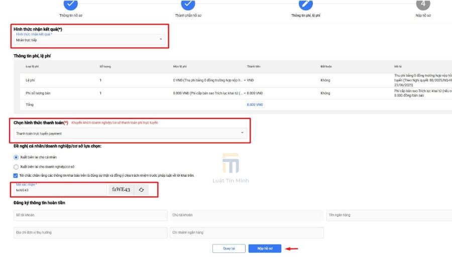 - Chọn hình thức thanh toán lệ phí (nếu có).