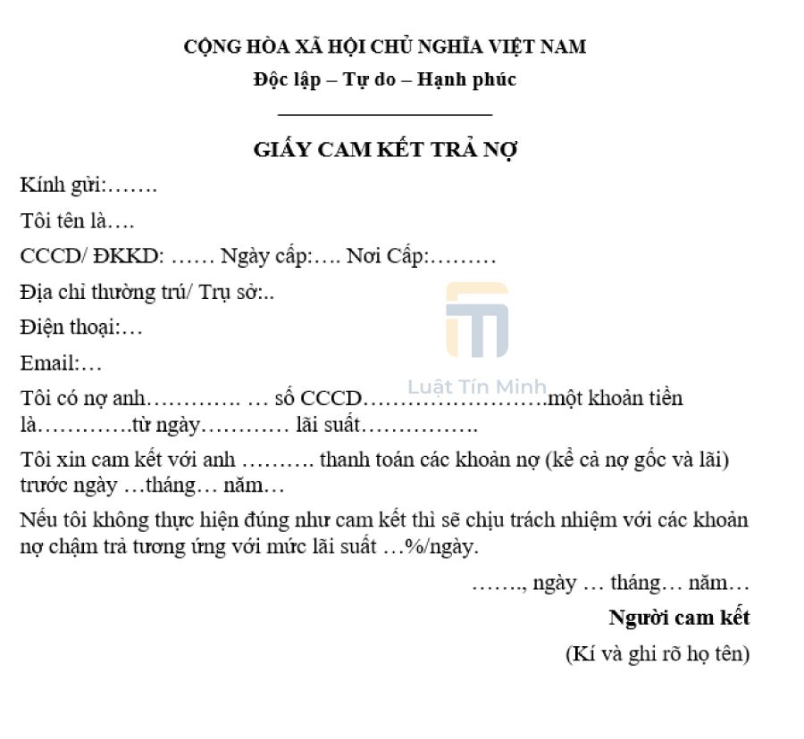 Giấy cam kết trả nợ là loại giấy (văn bản) thể hiện sự cam kết của bên vay (người nợ) về việc hoàn trả đầy đủ số tiền đã vay cho bên cho vay theo đúng thời hạn, phương thức và điều kiện mà hai bên đã thỏa thuận. Bản cam kết này được lập nhằm mục đích làm căn cứ ràng buộc trách nhiệm pháp lý giữa các bên, tránh tranh chấp, đồng thời thể hiện thiện chí, uy tín và trách nhiệm của người vay trong việc thực hiện nghĩa vụ tài chính của mình.