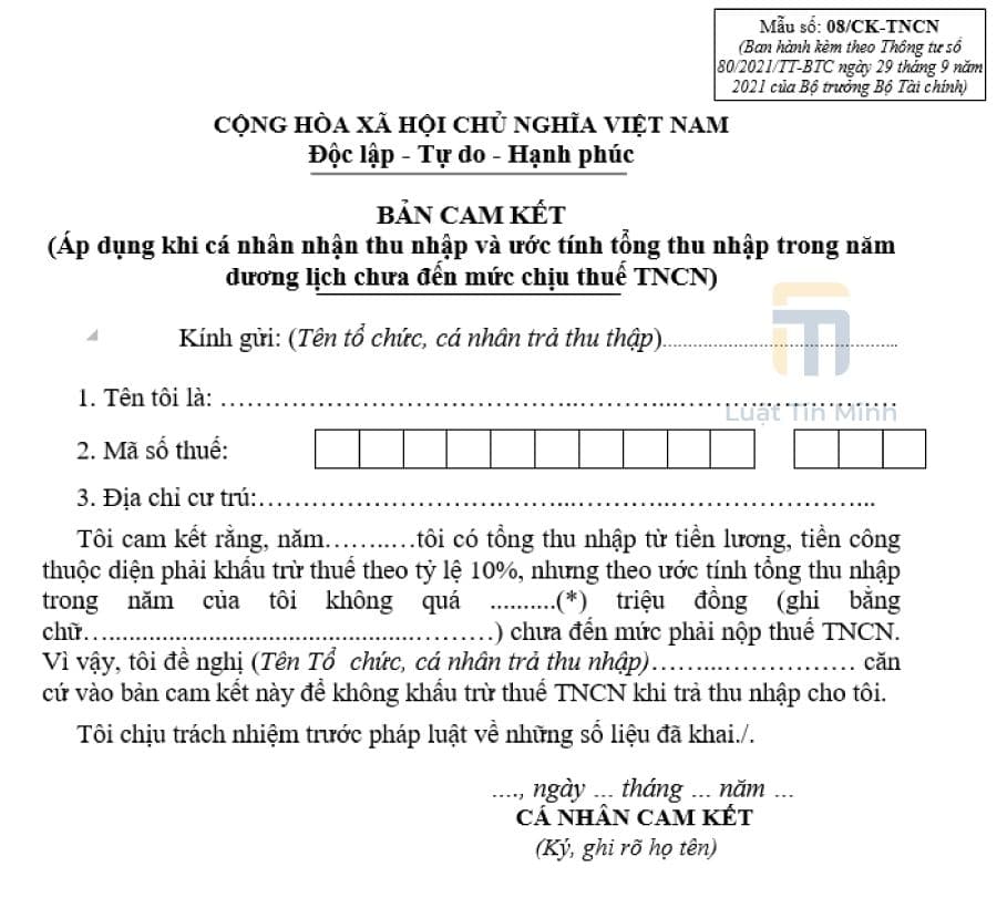 Hiện tại, mẫu bản cam kết thuế TNCN được sử dụng là mẫu 08/CK-TNCN ban hành kèm Thông tư 80/2021/TT-BTC của Bộ Tài chính.