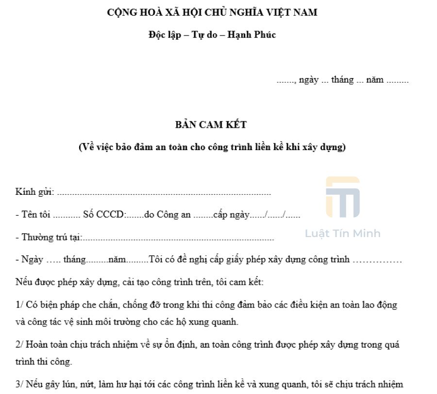 Mẫu cam kết đảm bảo an toàn xây dựng cho công trình liền kề thường được yêu cầu trong hồ sơ xin cấp giấy phép xây dựng.