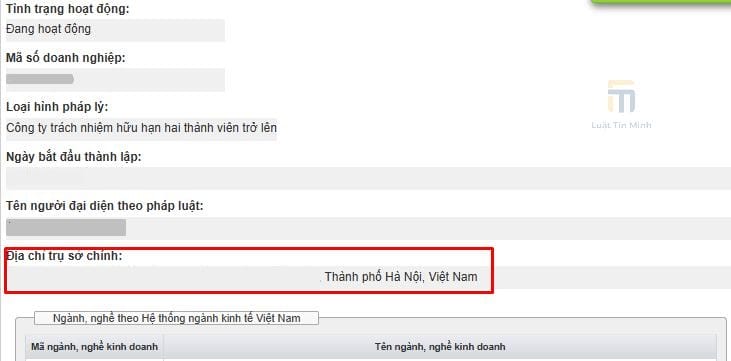 (*): Ngoài địa chỉ trụ sở chính, các thông tin cơ bản khác của doanh nghiệp mà hệ thống sẽ hiển thị gồm: tên doanh nghiệp (tên viết tắt, tên bằng tiếng nước ngoài), tình trạng hoạt động, mã số doanh nghiệp, loại hình doanh nghiệp (loại hình pháp lý), ngày bắt đầu thành lập, tên người đại diện theo pháp luật, ngành nghề kinh doanh.